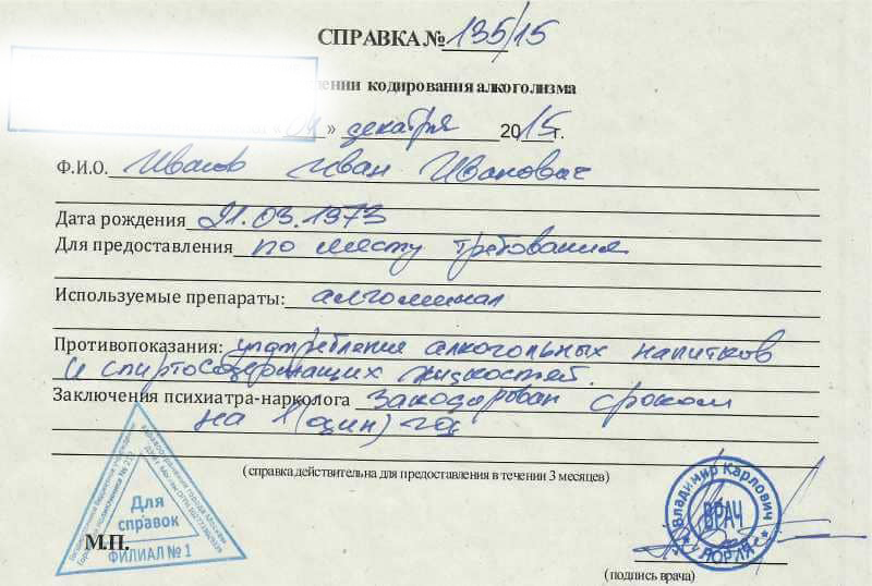 В обычной наркологической клинике процедура займет длительное время. Придется записаться к врачу, пройти обследование, сделать детокс, долго воздерживаться от алкоголя. Далее оплачивается стоимость услуги, выполняется подшивка или кодировка, выдается медицинская справка. В документе указываются: