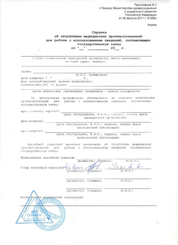 Медицинская справка подтверждает отсутствие противопоказаний для работы с секретными документами и материалами, содержащими гостайну. Заключение пишут согласно специальному приказу, оно имеет строгие требования к содержанию и форме.